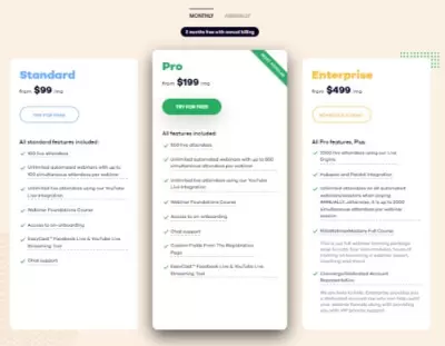 - Standard plan – From $83 per month for 100 live attendees (billed annually).